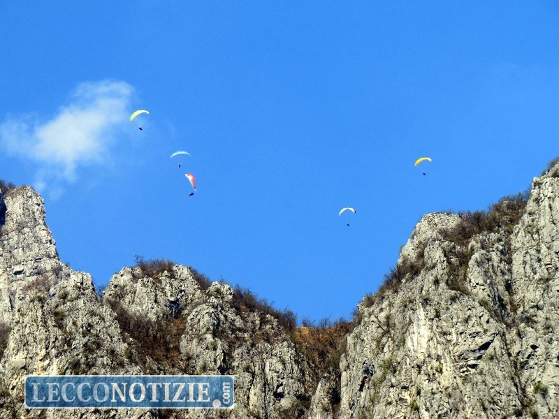 LECCO – Spettacolo non programmato quello che hanno offerto, poco dopo le 13 di oggi, domenica, 6 parapendisti che per mezz’ora abbondante hanno volteggiato sopra le cime dei monti Medale, San Martino, Corno Regismondo e Coltignone.  Una vera e propria danza tra il blu del cielo che i sei hanno regalato ad un pubblico lontano che, naso all’in su, ha assistito meravigliato ai leggiadri volteggi.