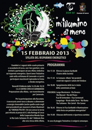 La sfilata, animata da torce a dinamo o a risparmio energetico (chi ne fosse sprovvisto può acquistarle a 2 euro presso la Bottega di Lecco della Cooperativa Mondo Equo, in via Carlo Cattaneo 29), partirà alle 17.30 da piazza Garibaldi. Alle 17.45, al Palazzo Comunale, si terrà una presentazione di alcuni prodotti creati dai ragazzi, seguita dal saluto del sindaco di Lecco, Virginio Brivio.