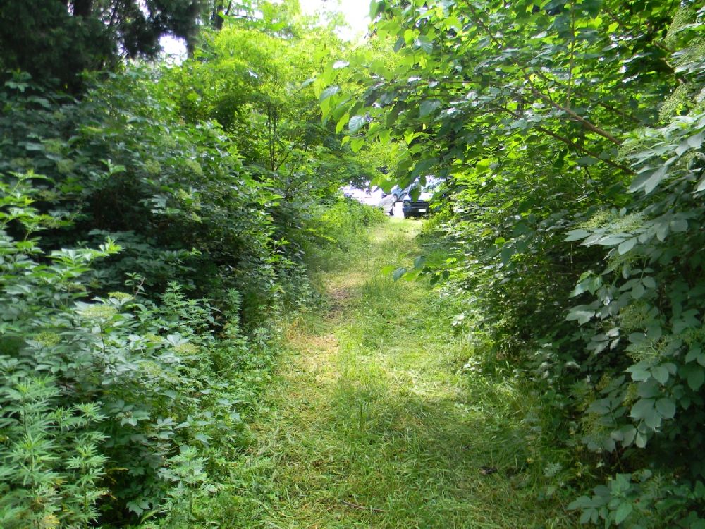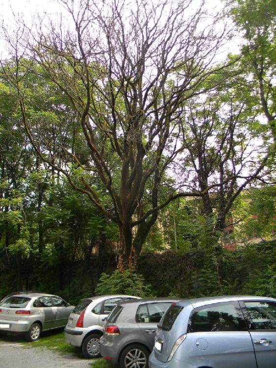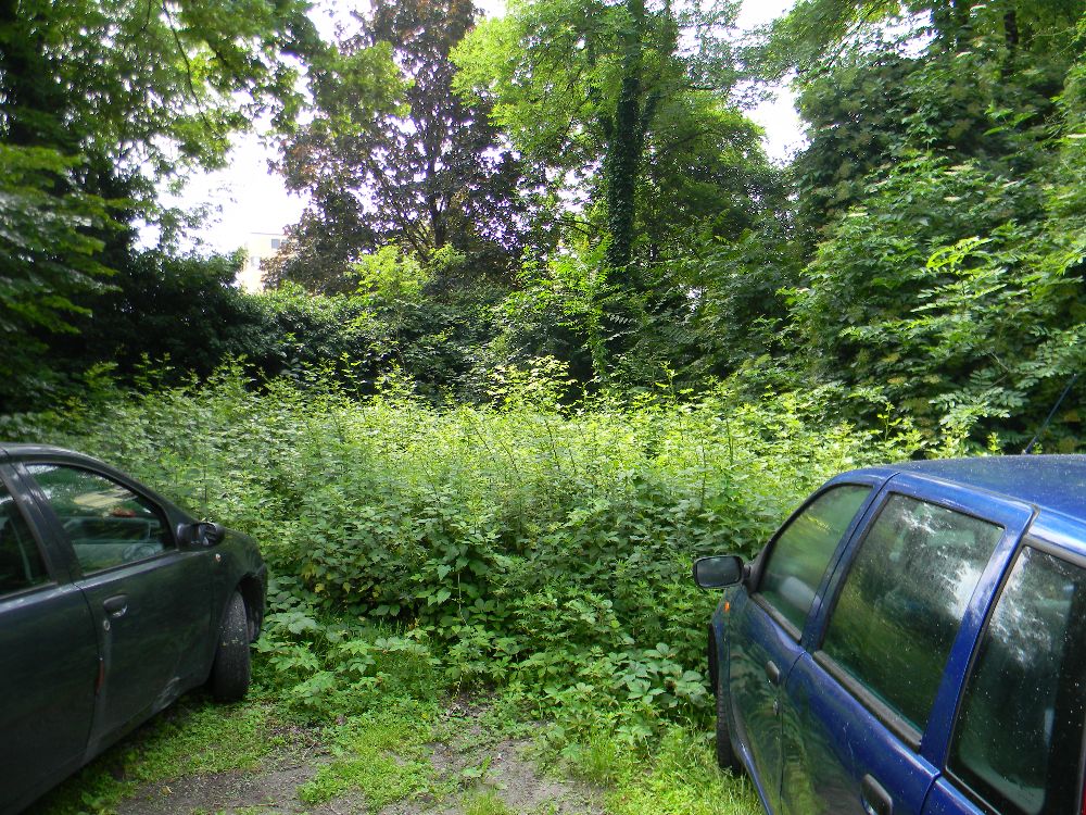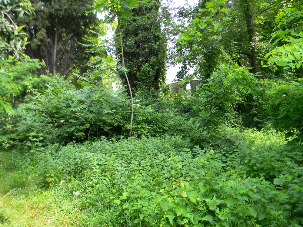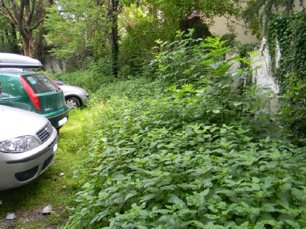 Ora, non solo la situazione è pietosa per quanto concerne la piccola giungla, dove a quanto pare roditori e rettili la fanno da padroni, ma anche le piante hanno raggiunto altezze ragguardevoli e la fitta boscaglia, che si è venuta a creare, è diventata un ricettacolo di sporcizia. Nel parcheggio campeggia un grosso noce malato, probabilmente perchè avvolto dall’edera come del resto altre piante, mentre un albero d’alto fusto tutto rinsecchito è ormai morto. Inoltre tutto intorno al parcheggio corre una cintura verde di erbacce divenute così rigogliose che hanno ormai nascosto il muro di cinta a suo volta mal messo e pericolante.