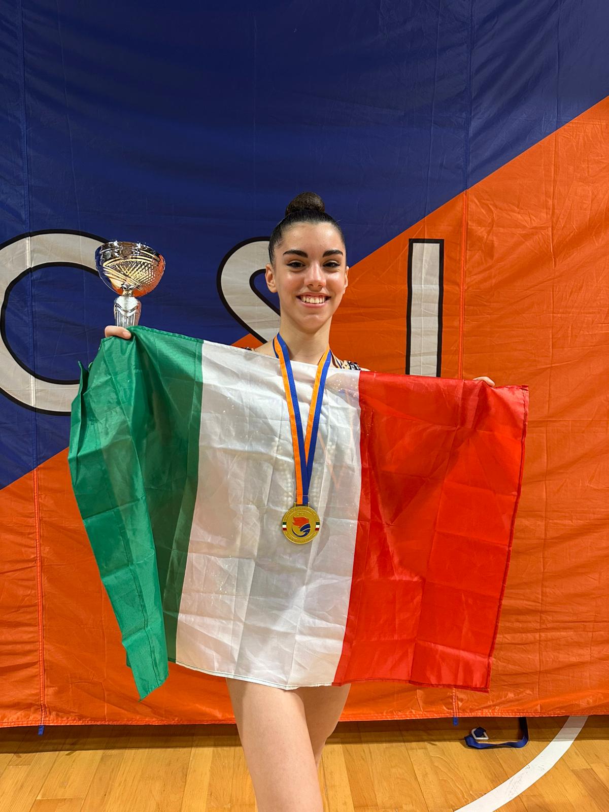 Asia Zuliani, insieme alla sua compagna Sarah Cirillo sale sul gradino più alto del podio conquistando l’oro italiano nella classifica coppia cerchi 1° categoria.