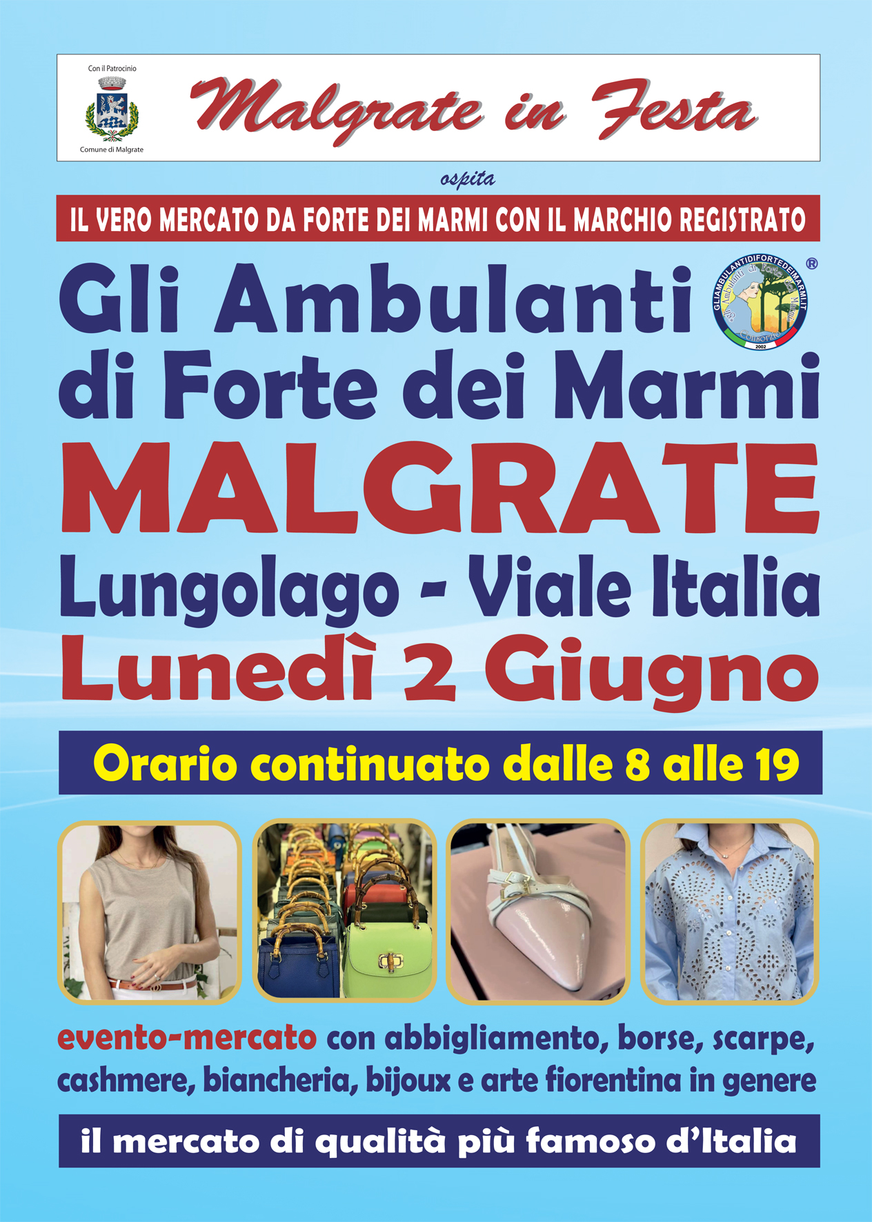 MALGRATE – Gli Ambulanti di Forte dei Marmi®, le bancarelle del mercato di qualità più famoso d’Italia, tornano finalmente nel Lecchese con il loro show itinerante all’insegna del meglio del Made in Italy artigianale e delle ultime tendenze della moda. Con l’estate alle porte, si potranno ammirare le ormai mitiche boutique a cielo aperto® dell’originale Consorzio lunedì 2 giugno a MALGRATE, alle porte di Lecco, nella incantevole cornice del Lungolago di Viale Italia, con il patrocinio dell’amministrazione comunale. Dunque, un’iniziativa – nell’ambito di “Malgrate in festa” – da non perdere assolutamente per i tanti appassionati del genere che l’hanno a lungo reclamata: come sempre una rassegna dello shopping più glamour e conveniente, con orario continuato, anche in caso di maltempo, dalle 8 alle 19.