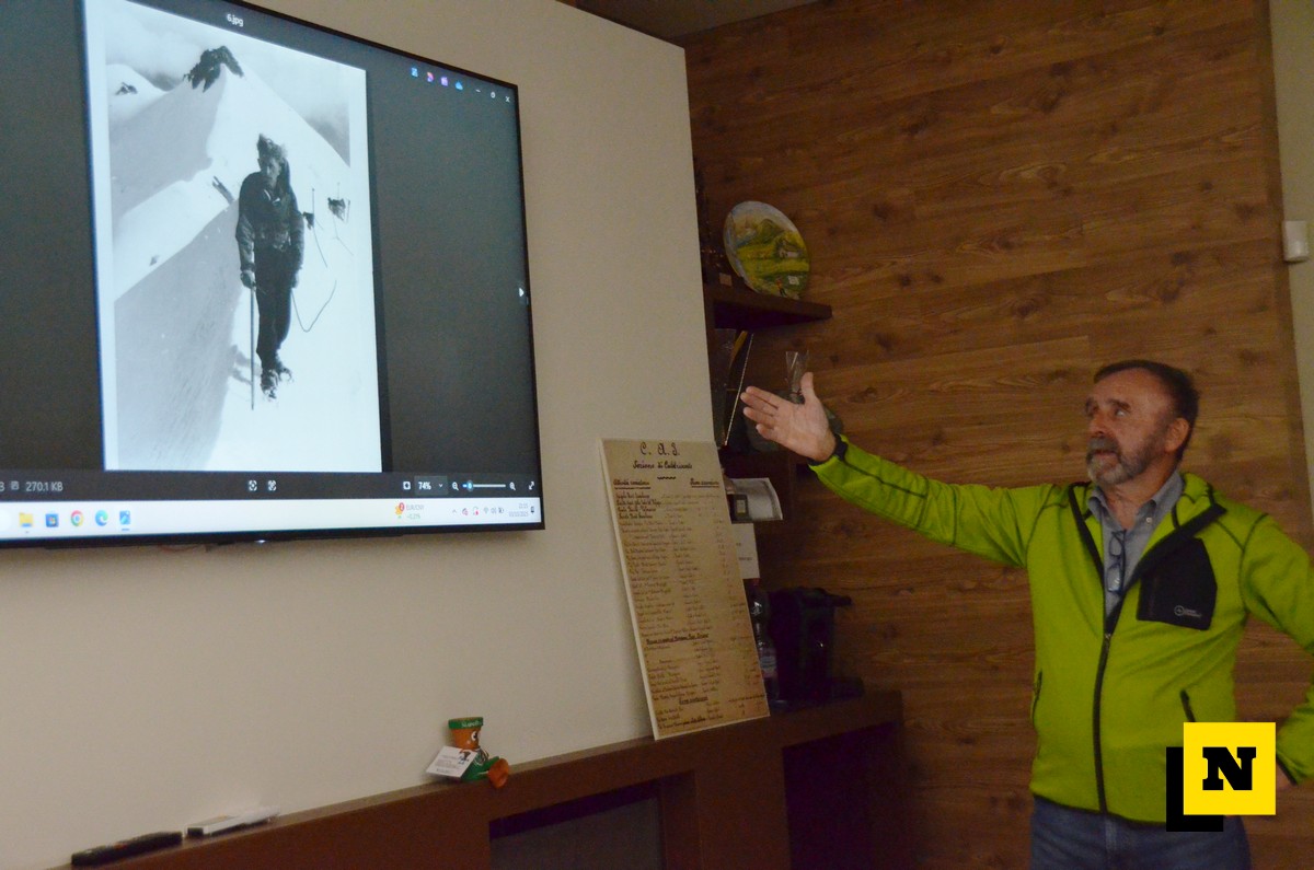 La serata ha riservato molte emozioni, dopo un excursus sull’evoluzione dei materiali, Giuseppe Rocchi ha ricordato, attraverso le foto storiche, la nascita del Cai Calolziocorte nel 1945 con una dedica speciale al fortissimo alpinista Ercole Esposito, detto “Ruchin”, a cui la sezione è intitolata e che trovò la morte in Dolomiti (Sasso Lungo) proprio nell’anno della nascita del club, il 23 settembre.