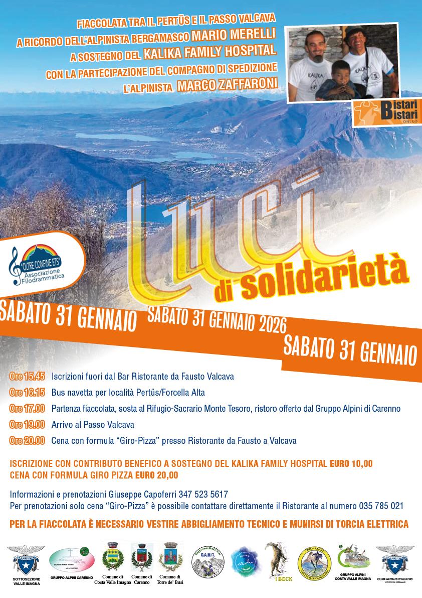 CARENNO – E’ prevista per sabato 31 gennaio 2026 la 14^ edizione della fiaccolata “Luci di Solidarietà”, evento benefico dedicato alla memoria dell’alpinista bergamasco Mario Merelli e al sostegno del Kalika Family Hospital, l’ospedale in Nepal voluto e fondato dallo stesso Merelli insieme a Marco Zaffaroni.