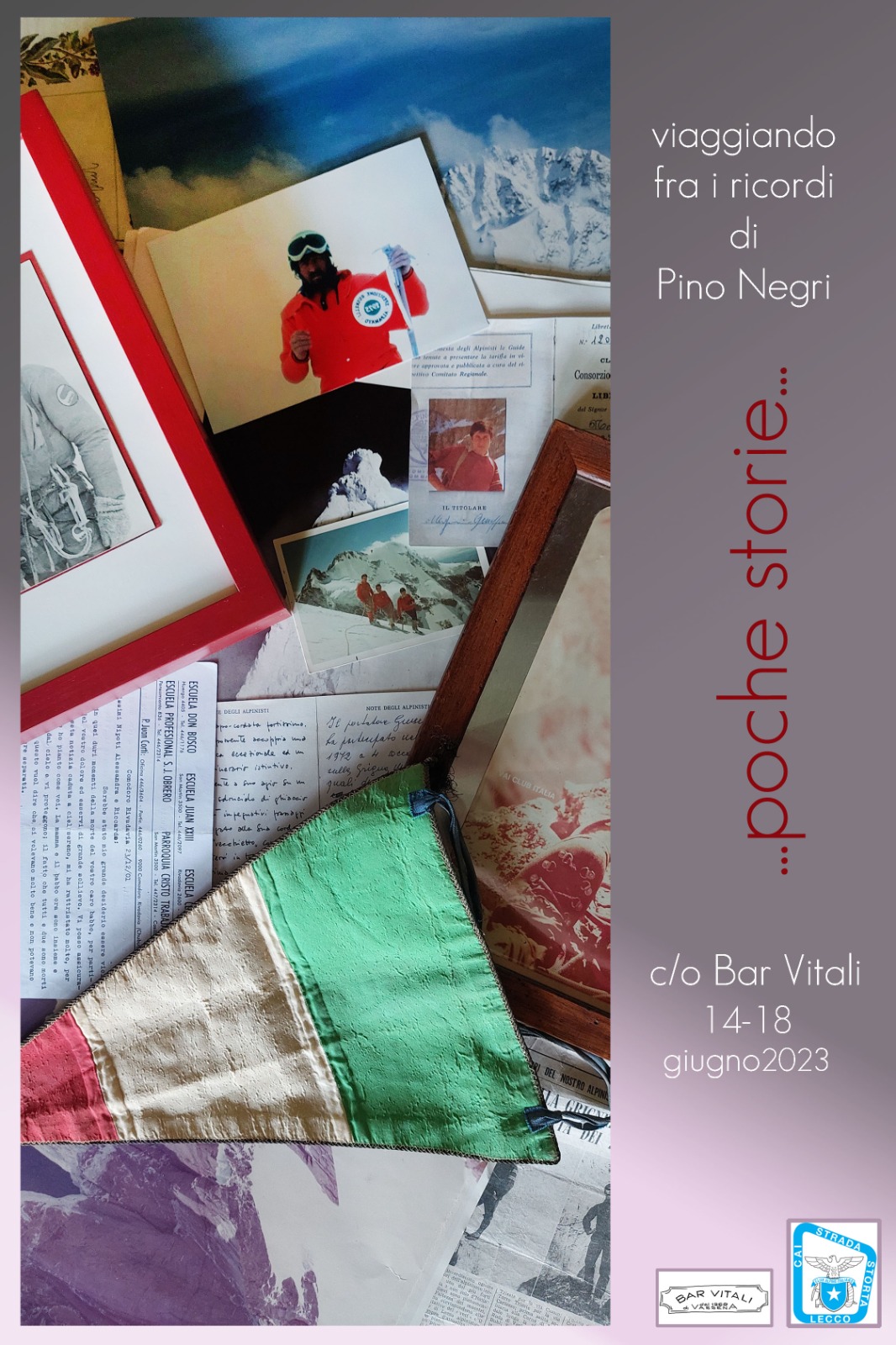 Proprio con questo intento la figlia di Pino Negri, Alessandra, ha pensato di allestire una piccola (ma particolare) mostra, intitolata “Poche Storie”, per raccontare suo padre, classe 1945, morto ancora giovane, il 23 novembre 2001, folgorato da un infarto. Fino a domenica 18 giugno (data del tradizionale raduno ai Piani d’Erna dedicato all’alpinista lecchese) i tavolini del Bar Vitali, in piazza della Vittoria ad Acquate, saranno trasformati in teche dove è possibile conoscere la storia di Pino Negri attraverso ritagli di vecchi giornali, fotografie, diari, lettere…