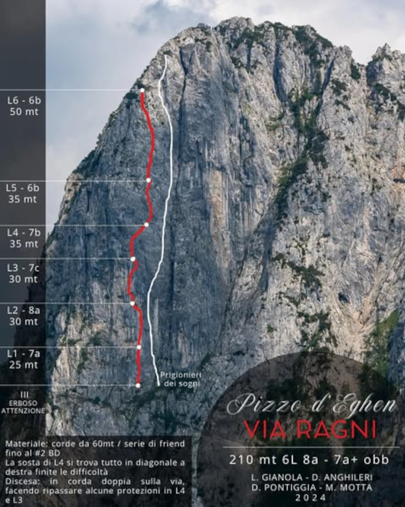 Il Pizzo D’Eghen si trova in uno dei luoghi più selvaggi della Grigna Settentrionale e la via Ragni è stata aperta e liberata in 7 giornate nell’estate 2024. Il nuovo itinerario sale alla sinistra della mitica “Prigionieri dei Sogni” (aperta da Adriano Selva e Andrea Spandri nel 2005), 210 metri (6 lunghezze) con difficoltà  8a – 7a+ obbligato.