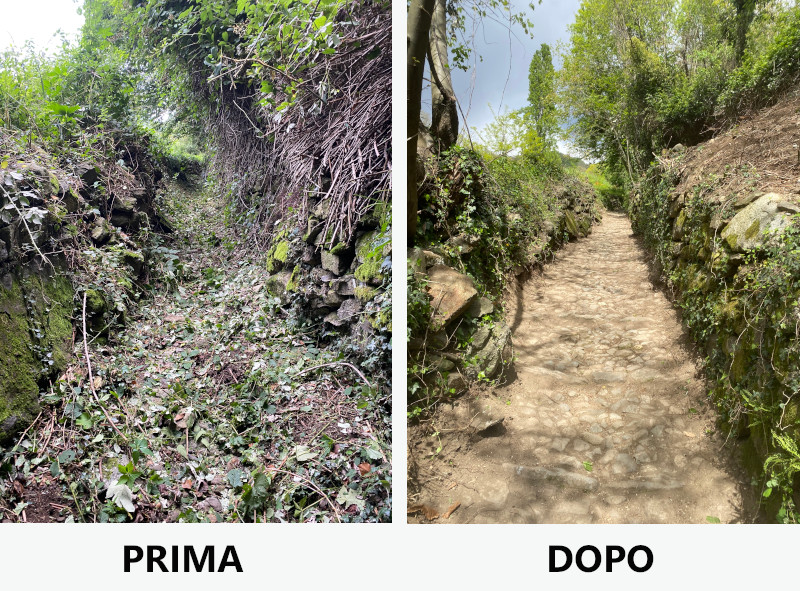 Il prima e il dopo di uno degli interventi lungo la mulattiera Cereda – Montalbano