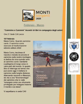 Il primo appuntamento si terrà il 18 febbraio in compagnia di Maria Corno, autrice del libro “Quando cammino canto. Il cammino come esercizio di trasformazione“, Ediciclo editore 2022. Maria Corno, lecchese di nascita e iniziata da piccola al cammino sulle nostre montagne, si dedica da circa quindici anni al cammino come viandante e pellegrina di lungo corso in varie parti del mondo. In questo libro si interroga sul senso che può avere oggi il mettersi in cammino sulle lunghe distanze. Alternando racconti e riflessioni, dà vita a una “fenomenologia” del cammino che lo vede “emergere come uno strumento privilegiato per indagare insieme il mondo e se stessi”.