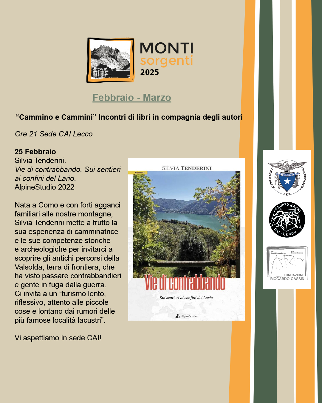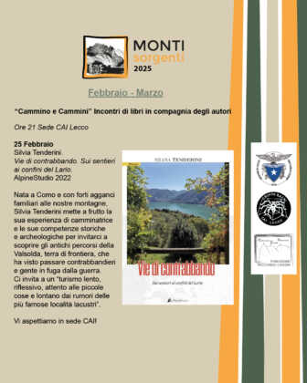 Il secondo incontro, invece, sarà il 25 febbraio con Silvia Tenderini autrice di “Vie di contrabbando. Sui sentieri ai confini del Lario“, AlpineStudio 2022. Nata a Como e con forti agganci familiari alle montagne lecchesi, Silvia Tenderini mette a frutto la sua esperienza di camminatrice e le sue competenze storiche e archeologiche per invitarci a scoprire gli antichi percorsi della Valsolda, terra di frontiera. Un crocevia che ha visto passare contrabbandieri e gente in fuga dalla guerra. Ci invita a un “turismo lento, riflessivo, attento alle piccole cose e lontano dai rumori delle più famose località lacustri”.
