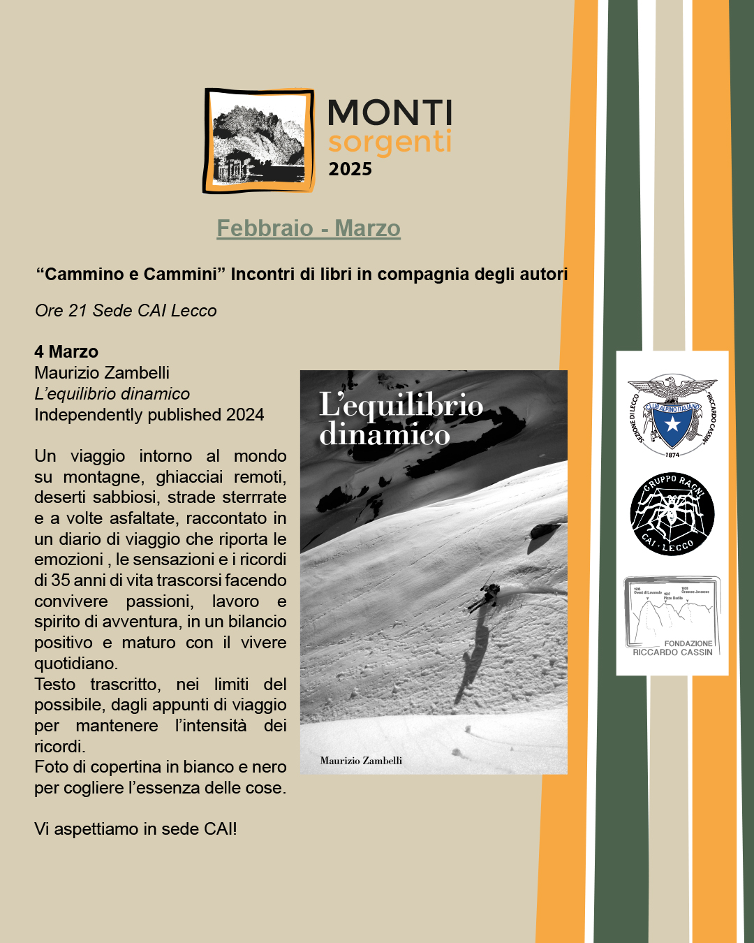 L’ultima tappa di questo primo mini ciclo di “Monti Sorgenti” sarà il 4 marzo insieme a Maurizio Zambelli e il suo libro “L’equilibrio dinamico“, Independently published 2024. Un viaggio intorno al mondo su montagne, ghiacciai remoti, deserti sabbiosi, strade sterrate e a volte asfaltate, raccontato nel diario di un valsassinese che riporta le emozioni, le sensazioni e i ricordi di 35 anni di vita trascorsi facendo convivere passioni, lavoro e spirito di avventura, in un bilancio positivo e maturo con il vivere quotidiano. Testo trascritto, nei limiti del possibile, dagli appunti di viaggio per mantenere l’intensità dei ricordi. Foto di copertina in bianco e nero per cogliere l’essenza delle cose.
