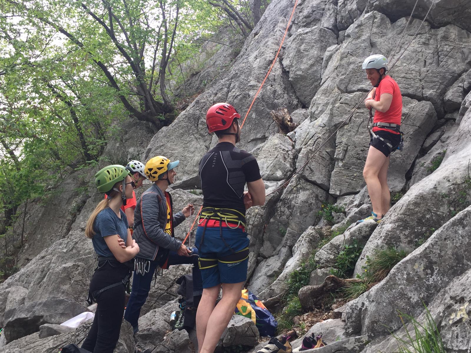Giunti alle placchette i partecipanti a turno, sia i bambini sia gli adulti, hanno indossato casco, imbrago, scarpette e hanno ricevuto le informazioni fondamentali per iniziare la progressione su roccia e vivere l’ebrezza di salire lungo una parete rocciosa arrampicando.