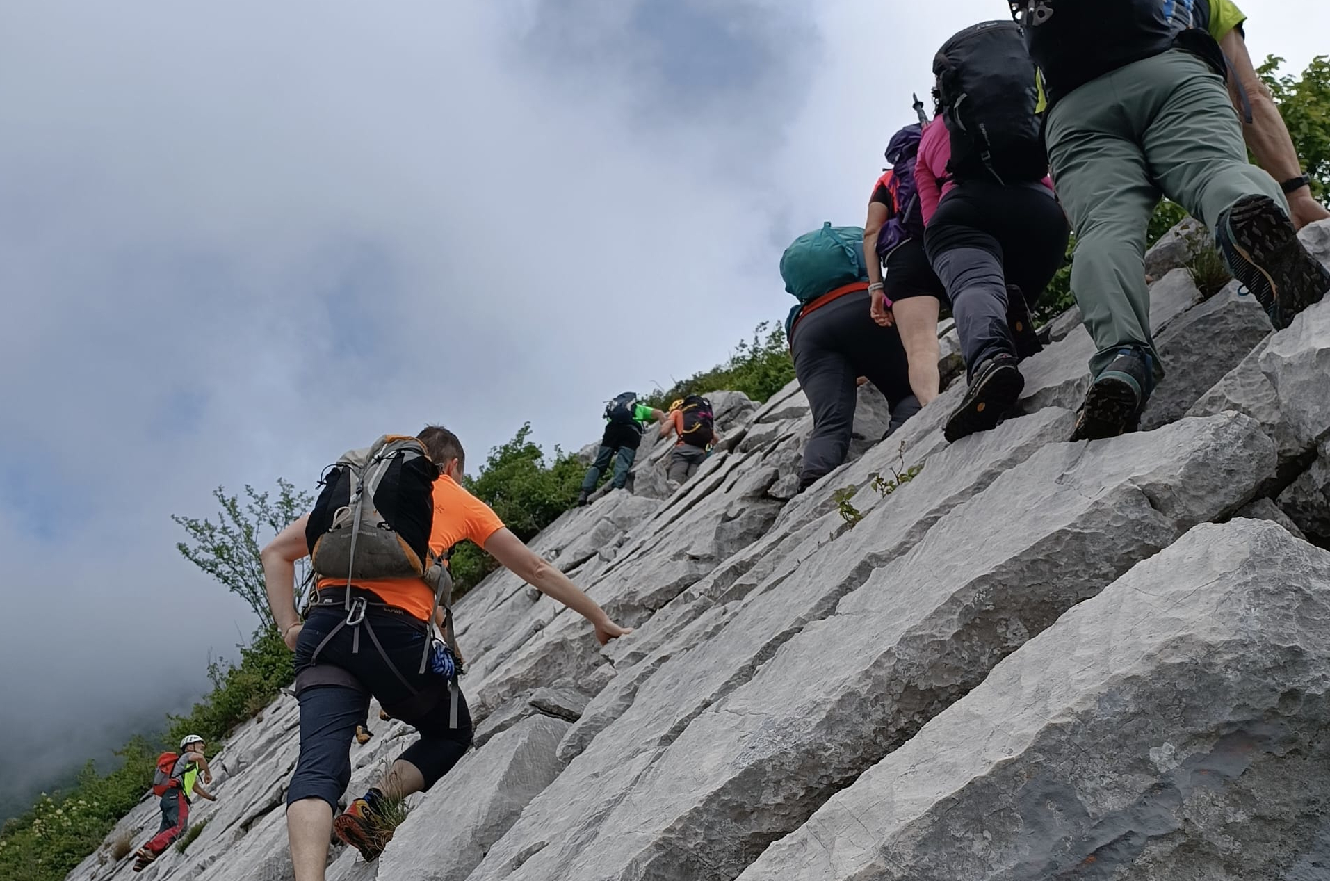 La gita ha avuto inizio in località Ortello (690 m), dove i 15 partecipanti hanno imboccato prima il ripido sentiero 206, successivamente il 287 e dopo aver percorso un tratto nel bosco sono giunti al tratto più tecnico, di facile difficoltà. Da questo settore del tracciato, il gruppo scatena la propria voglia di appoggiare le mani sulla roccia, divertendosi a scalare prima una paretina di I-II grado, seguita da crestine affilate, con tratti esposti (fino al III grado), per arrivare con un pezzo più facilmente camminabile, su una bastionata rocciosa di II grado, in vetta al monte Pizzocolo.