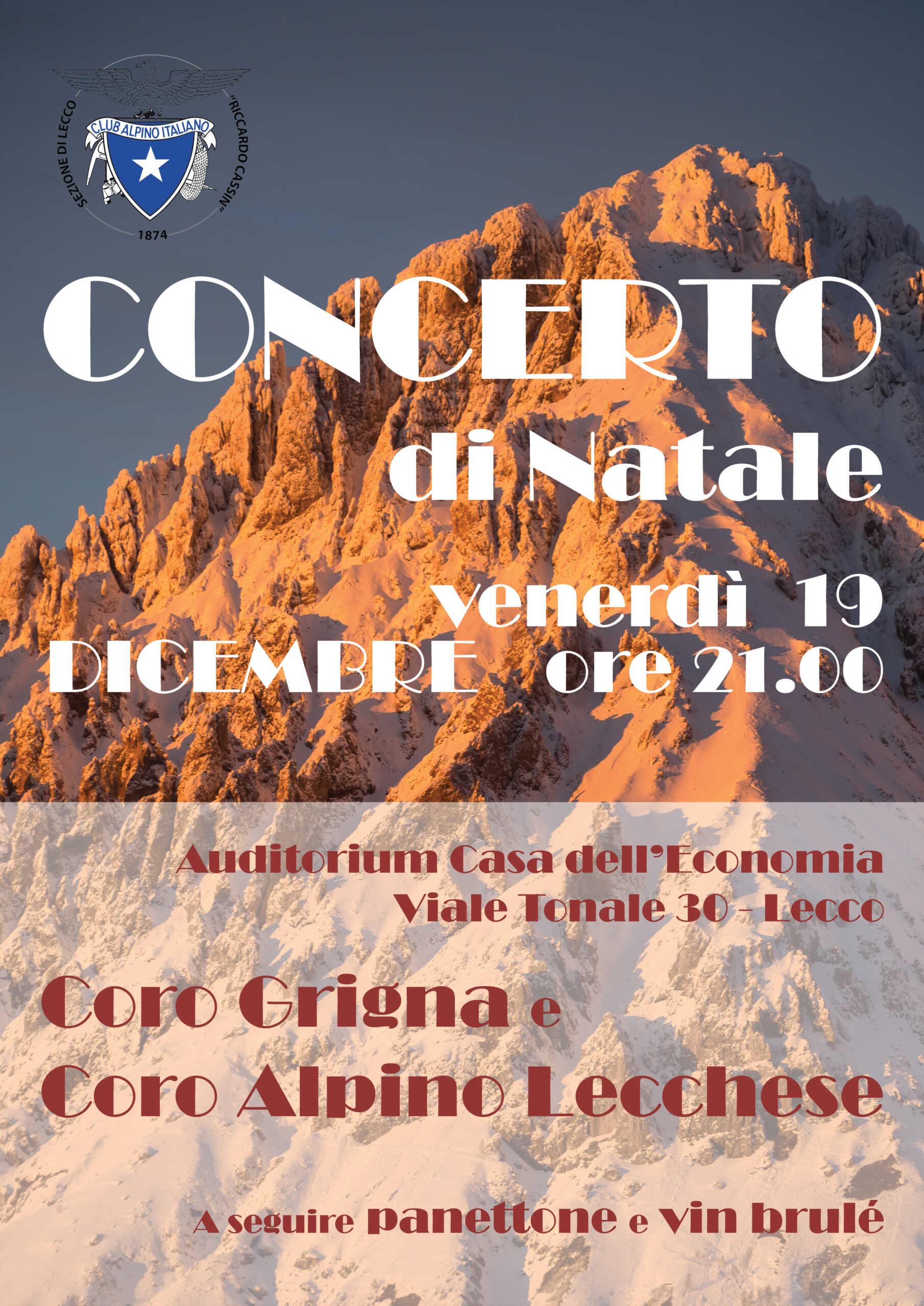 LECCO – Tradizionale appuntamento del Cai Lecco in programma per venerdì 19 dicembre ore 21 presso l’Auditorium della Camera di Commercio di Lecco. Il Concerto di Natale sarà anche l’occasione per consegnare i riconoscimenti ai soci iscritti da 50, 60 e 70 anni.