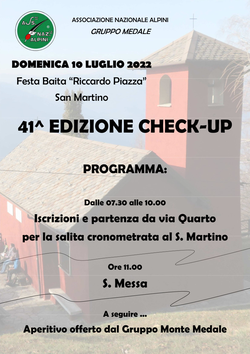 Dopo due anni di stop a causa della pandemia da Covid-19, il Check Up torna come sempre sotto la regia del Gruppo Alpini Monte Medale di Rancio e Laorca. Un evento che nell’evento, infatti la gara di corsa è organizzata in occasione della festa della baita “Riccardo Piazza”, ovvero il rifugio divenuto negli ultimi anni, come come la cappelletta che la precede lungo il sentiero, meta di numerossimi escursionisti.