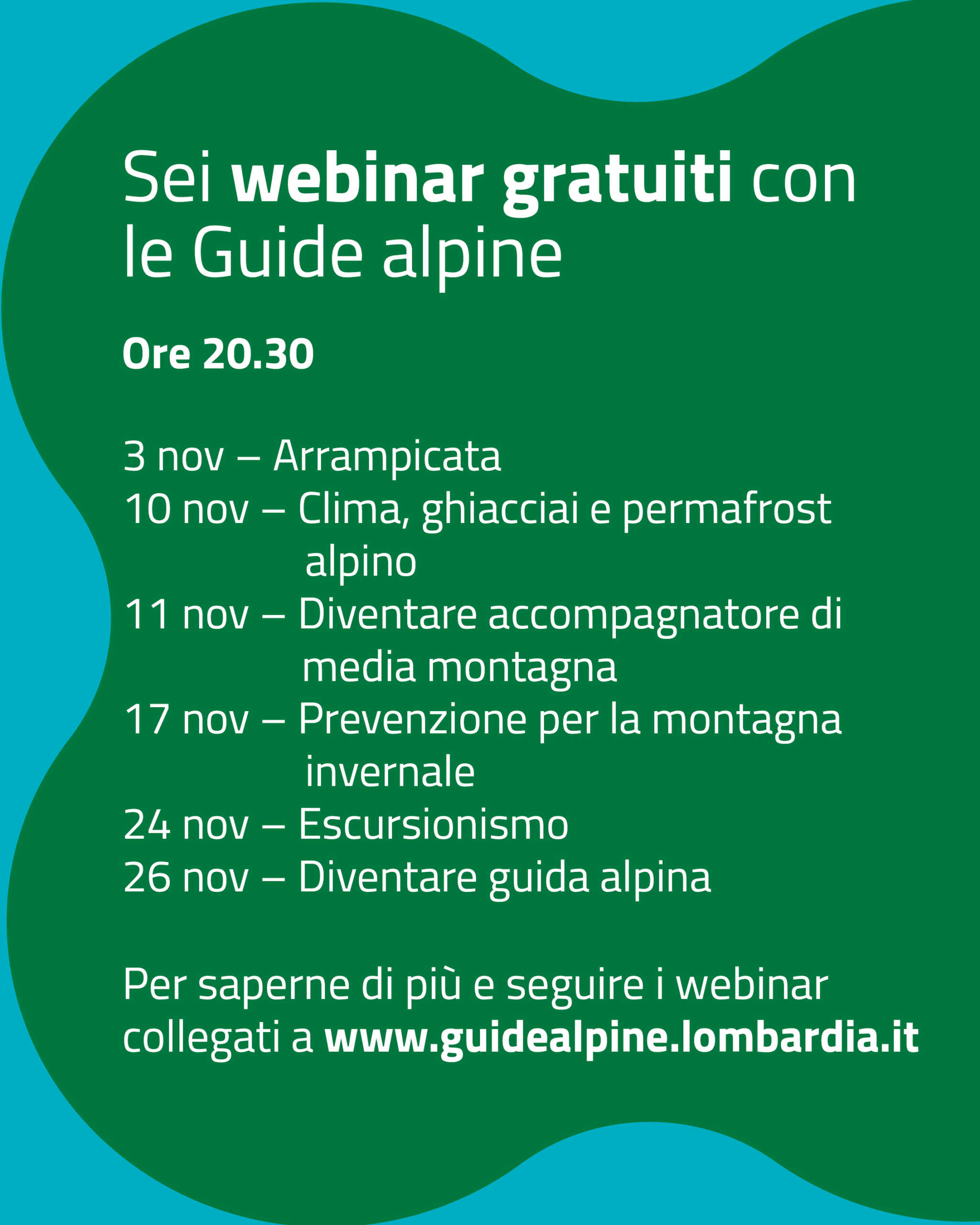 Gli argomenti trattati saranno: Arrampicata, Clima, ghiacciai e permafrost alpino, Diventare Accompagnatore di media Montagna, Prevenzione per la montagna invernale, Escursionismo e Diventare Guida alpina. Gli appuntamenti online, promossi in collaborazione con Regione Lombardia, si terranno in serata, alle 20:30.
