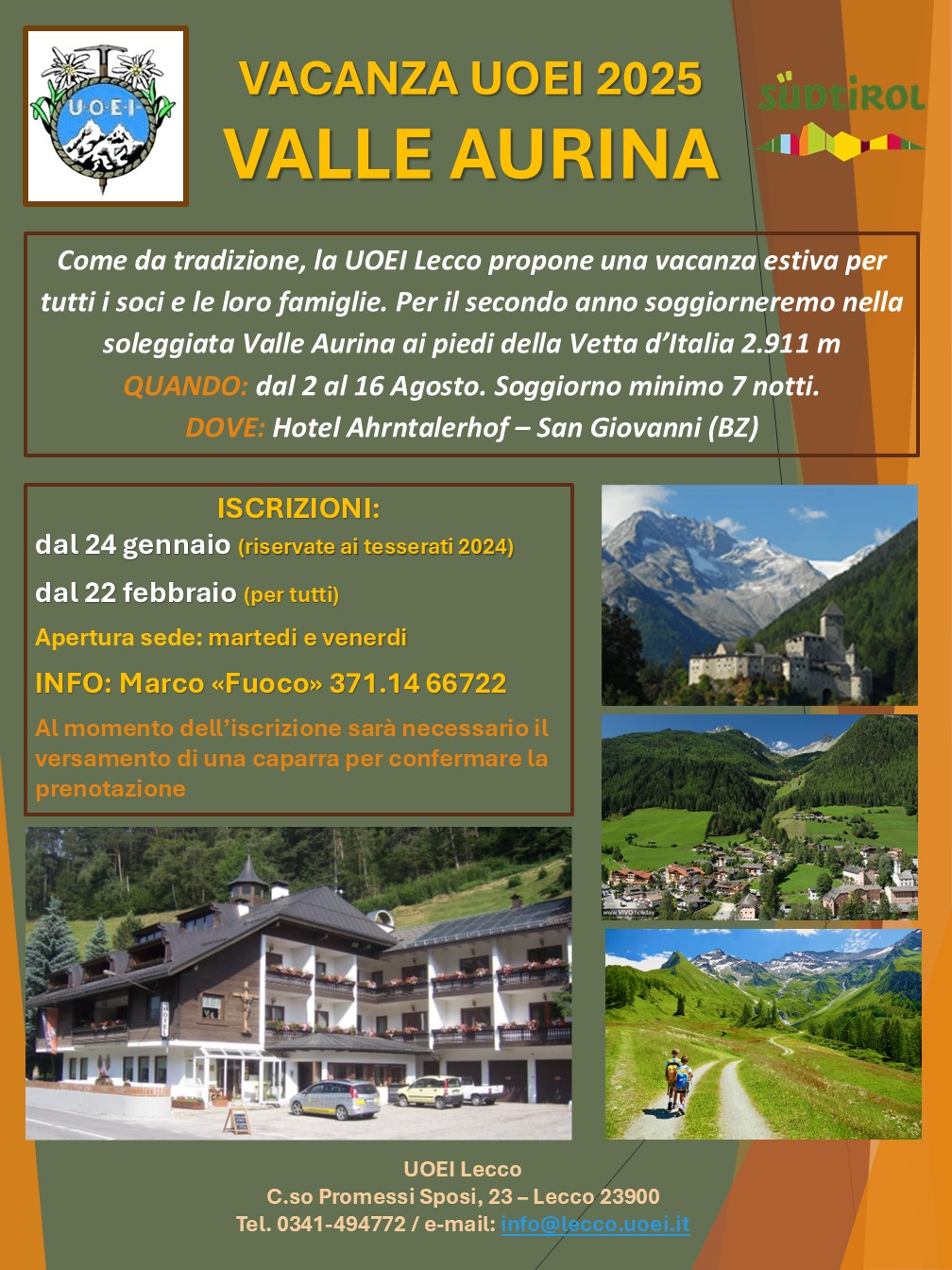 LECCO – Per il secondo anno consecutivo, visto il successo dell’edizione 2024, la vacanza estiva proposta dalla Uoei Lecco si terrà in Valle Aurina dal 2 al 16 agosto. La struttura scelta per l’estate 2025 è l’Hotel Ahrntalerhof di San Giovanni che permetterà di ospitare fino ad 80 persone.