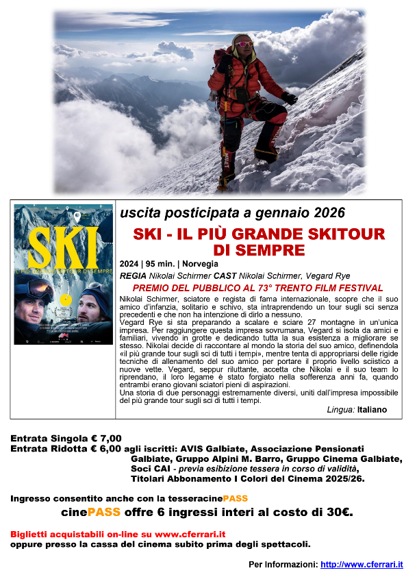 L’appuntamento successivo della rassegna è per mercoledì 26 novembre, sempre alle 21 con Sophie Lavaud: L’ultima cima. La pellicola racconta la storia dell’alpinista Sophie Lavaud che è a una sola vetta dal “grande slam” himalayano. Il film ci immerge nel particolare mondo dell’alpinismo d’alta quota, dove gli scalatori camminano in bilico tra audacia e autoconservazione. L’uscita dell’attesissimo Ski – Il più grande Ski Tour di sempre è invece stata posticipata dalla distribuzione a Gennaio 2026.