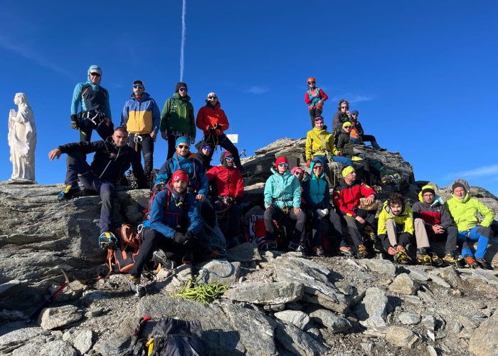 Grande soddisfazione e una leggera emozione hanno accompagnato tutti i partecipanti una volta raggiunta la vetta, favorita dalla splendida giornata di sole e dal panorama mozzafiato. Il Rutor, uno dei punti più panoramici della Valle d’Aosta, offre una vista a 360° su tutti i grandi massicci: Monte Bianco, Grand Combin, Cervino, Monte Rosa e Gran Paradiso.