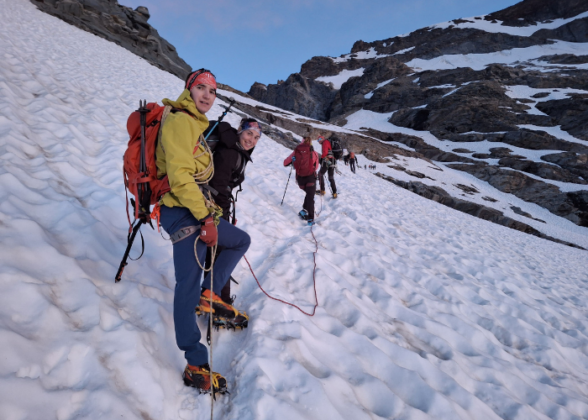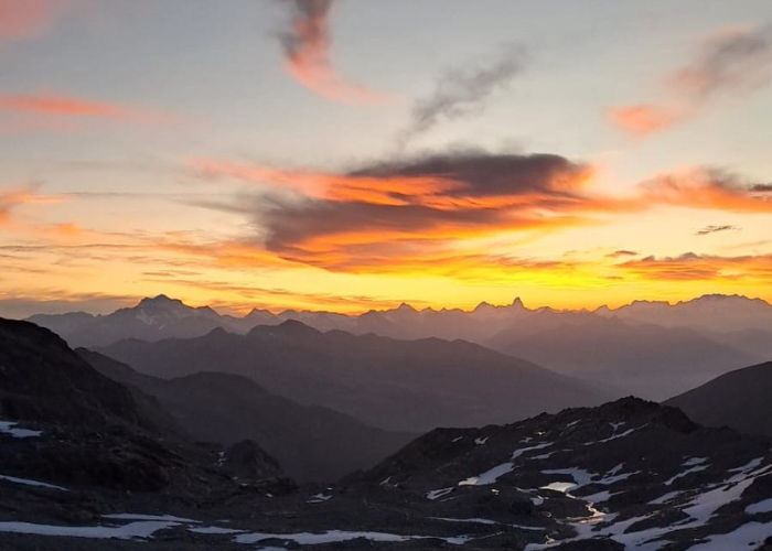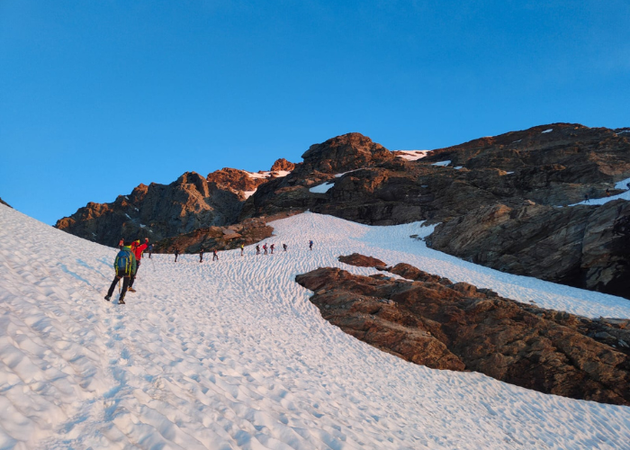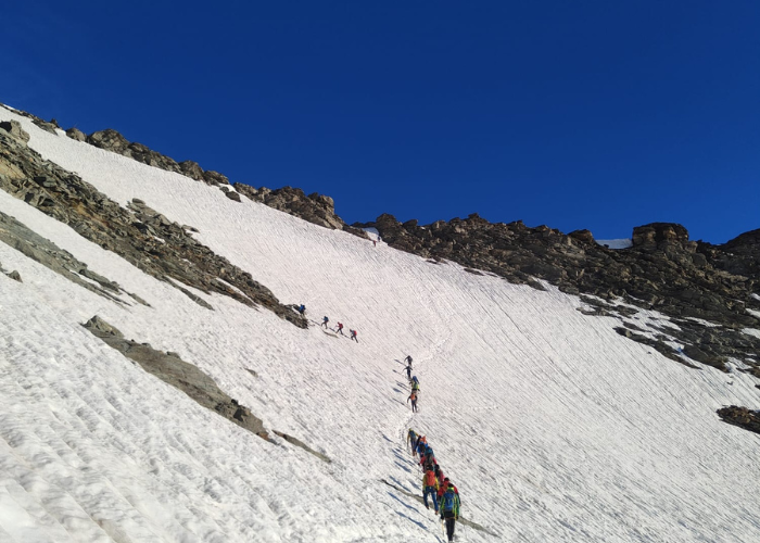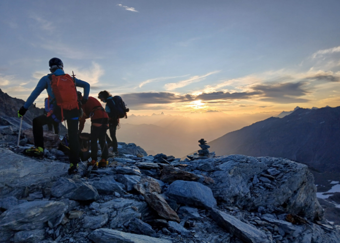 Ancora prima dell’alba di domenica, dopo un’abbondante colazione al rifugio, i partecipanti, legati in cordata e dotati di tutto il necessario per un’ascensione in sicurezza, hanno iniziato la salita. Il percorso è cominciato con un tratto ripido sul ghiacciaio del Morion, per poi proseguire attraversando la sommità dell’immenso ghiacciaio del Rutor, regalando loro una spettacolare alba.
