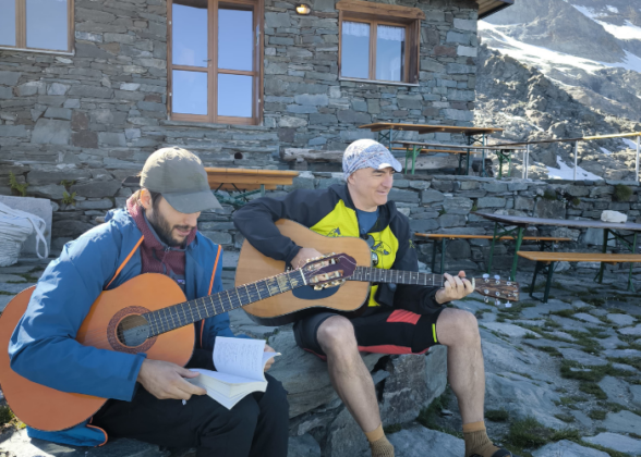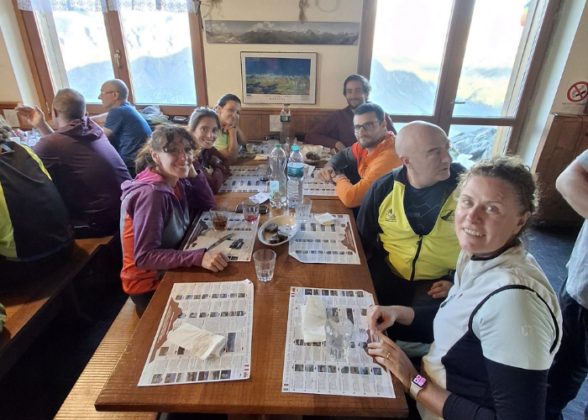 Dopo un pranzo al sacco sul posto, è iniziata la salita verso il Rifugio degli Angeli, situato su un panoramico sperone roccioso a 2916 metri e gestito con cura dai volontari dell’Associazione Mato Grosso, che hanno accolto il gruppo con calore, simpatia e una tazza di tè caldo. Prima di cena, la guida alpina ha guidato un ripasso delle manovre di corda e la formazione delle cordate, mentre la serata si è animata con allegria e canti accompagnati dalle chitarre.