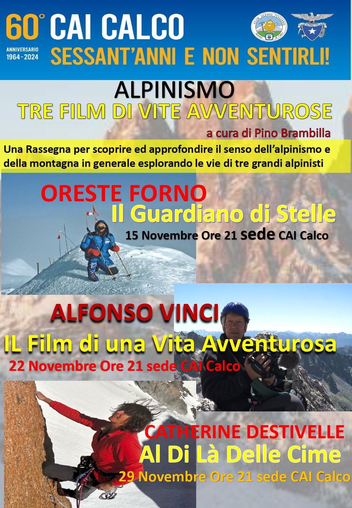 CALCO – Il Club Alpino Italiano – sezione di Calco, in collaborazione con il cineforum locale, propone una rassegna cinematografica dedicata all’alpinismo e alla montagna, dal titolo “Alpinismo: tre film di vite avventurose”. L’iniziativa si propone di approfondire il senso e la passione che animano gli alpinisti, attraverso la proiezione di tre documentari che raccontano le storie straordinarie di altrettanti grandi protagonisti dell’alpinismo.