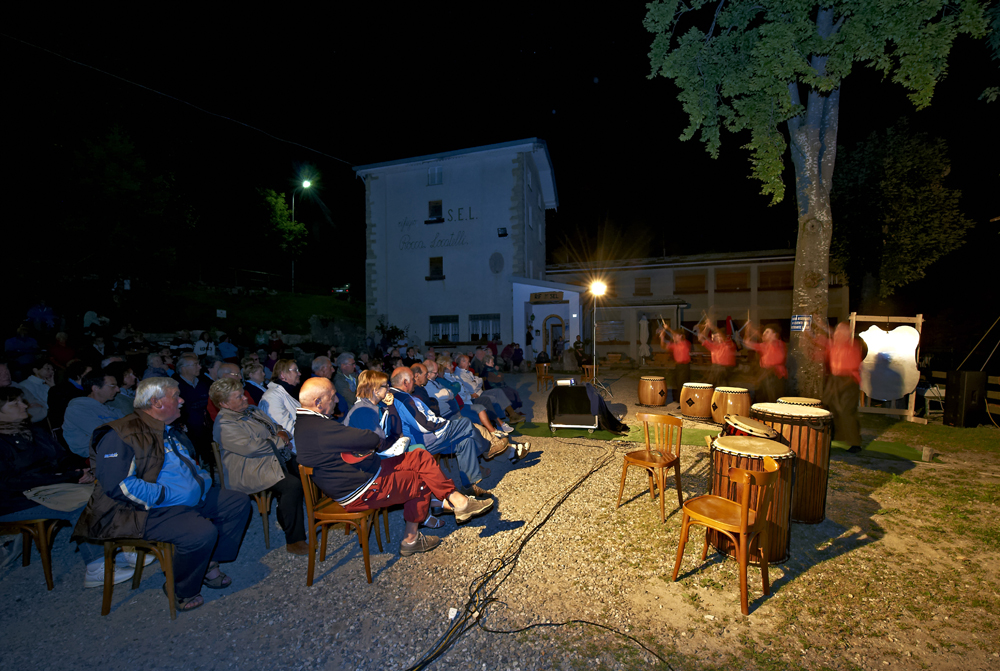 Grandi emozioni si sono vissute ai piedi della Grignetta martedì sera, nel piazzale del rifugio Sel Rocca Locatelli, quando Giorgio Galimberti ha dato il via allo spettacolo leggendo “4 paia di calze” di Daniele Redaelli accompaganto ai tamburi Taiko dei figli Tobia e Samuele e Giacomo Micheli.