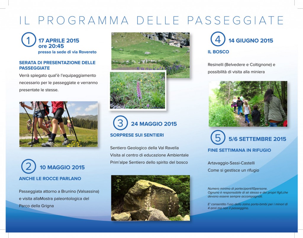 Così domenica 10 maggio, ci sarà la prima passeggiata intitolata “anche le rocce parlano”. Seguiranno domenica 24 maggio 2015 “sorprese sui sentieri”. Domenica 14 giugno 2015 “Il bosco”. Per concludere sabato 5 e domenica 6 settembre un fine settimana in rifugio al Sassi Castelli ai Piani di Artavaggio.