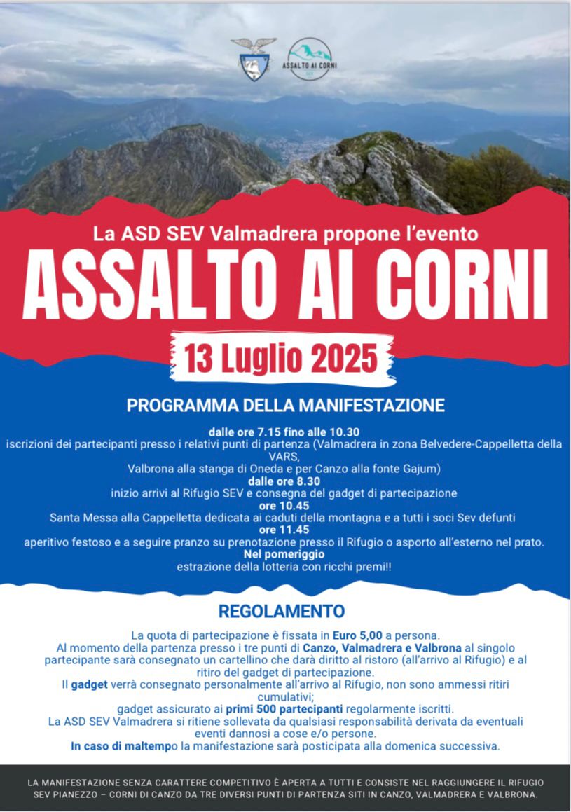 VALMADRERA – Domenica 13 luglio è in programma l’Assalto ai Corni, tradizionale manifestazione organizzata dalla Sev Valmadrera. Il programma è quello classico con partenza tra le 7.15 e le 10.30 dai tre punti a Canzo, Valmadrera e Valbrona (sotto la locandina con tutti i dettagli).