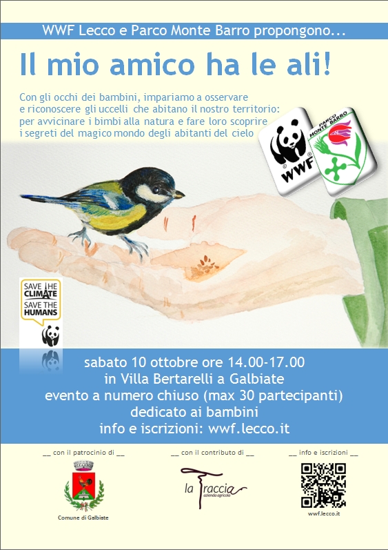 L’evento a numero chiuso è riservato a un massimo di 30 bambini e le iscrizioni chiudono giovedì 7 ottobre. Informazioni dettagliate, programma, orari, modalità di iscrizione… sono disponibili sul sito del WWF Lecco: http://wwf.lecco.it/il-mio-amico-ha-le-ali.