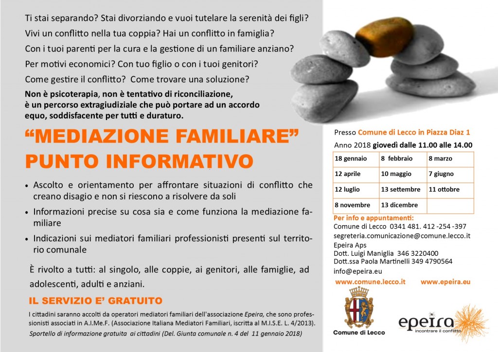 LECCO – Rinnovato la scorsa settimana in sede di Giunta comunale anche il protocollo d’intesa con l’Associazione di promozione sociale di Lecco Epeira_Incontrare il conflitto, grazie al quale prosegue la sperimentazione dello sportello informativo gratuito rivolto a tutti i cittadini del territorio provinciale di Lecco sulla mediazione familiare.