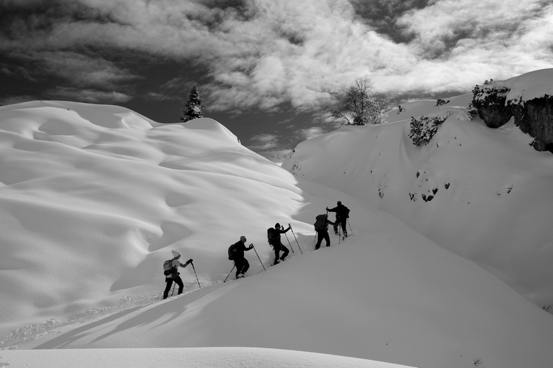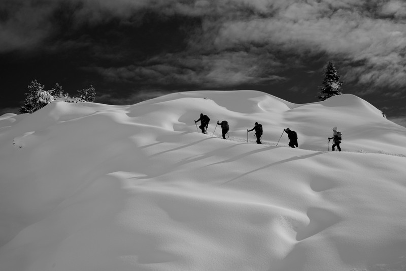 Nelle immagini si vedono piccoli gruppi di escursionisti avanzare lentamente, uno dietro l’altro, aprendo una traccia sottile nel candore immacolato. Le ombre si allungano, il cielo si fa denso di nubi, e ogni passo racconta la fatica e la meraviglia di muoversi dentro un paesaggio così puro e potente.