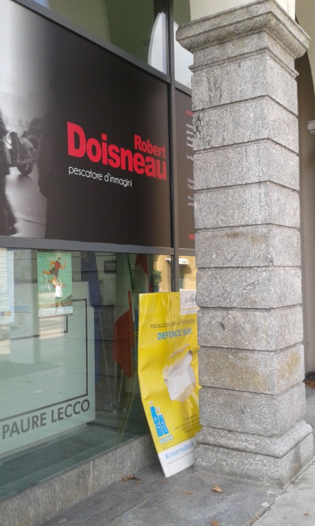 2) Cartellone pubblicitario deteriorato grande di colore giallo che, inutilmente adagiato dietro a una colonna, è visibile quasi come quello che pubblicizza la mostra “Robert Doisneau pescatore di immagini” unica rassegna a pagamento della due giorni culturale.