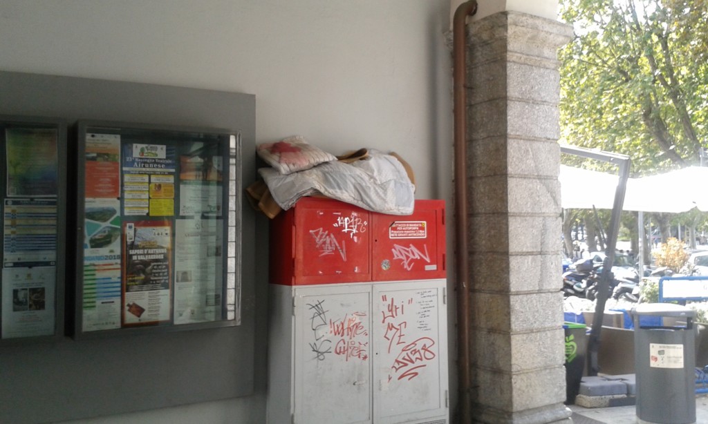 1) Coperta e accessori vari appoggiati sopra la cabina dei quadri elettrici esattamente di fronte all’ingresso del Palazzo.