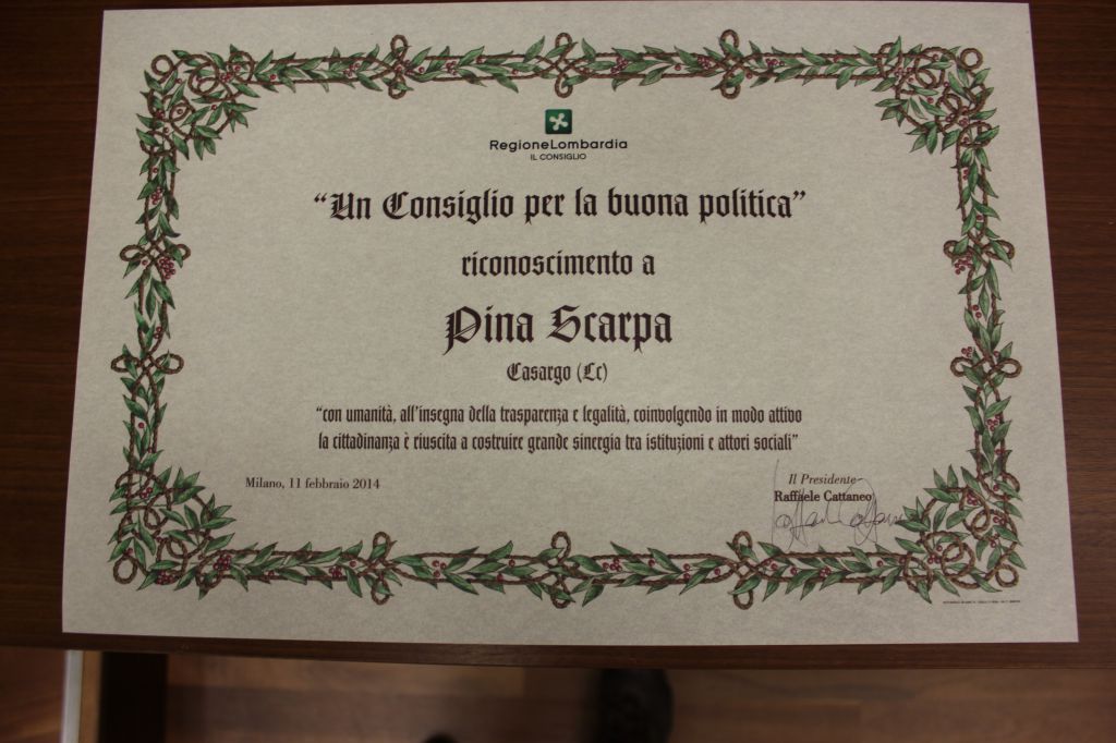“Pina Scarpa è un punto di riferimento non solo per Casargo ma per tutta la Valsassina – spiega il consigliere regionale Raffaele Straniero – Dopo aver conquistato, in pochi anni, con il suo impegno e la sua dedizione la comunità di Casargo, dapprima come assessore poi in veste di sindaco per due mandati, ha speso le sue energie per fare in modo che tutti i comuni dell’alta Valsassina, parlassero “con un’unica voce”. Da sindaco ha lavorato su diversi fronti dando sempre molta importanza ai rapporti personali – continua il consigliere democratico – con lei si è rafforzata la vocazione turistica di Casargo, senza per questo alterare il paesaggio ma sempre nel rispetto dell’ ambiente, si è valorizzata la realtà del Comune, in primis il centro di formazione professionale che ha acquisito una notevole importanza x la qualità della sua proposta formativa, ed infine efficace si è rivelata l’azione dei servizi sociali, prestando particolare attenzione alle persone e alle famiglie in difficoltà. Per tutte queste ragioni mi sono sentito di proporre il sindaco Scarpa per questo importante riconoscimento regionale e ringrazio l’Ufficio di presidenza del Consiglio per aver recepito la mia proposta”.