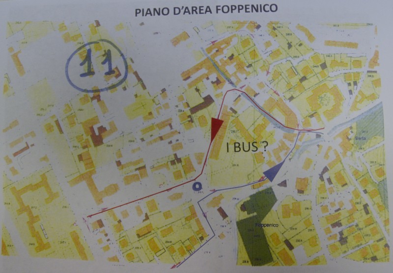 Il piano d’area per il quartiere di Foppenico – “Prevede il senso unico del tratto via Asilo – Piazza Verdi, a cui segue un senso unico in discesa che giunge sino in via Battisti; ma nel tratto di strada da via Asilo a Piazza Verdi, vi è una strettoia, che renderebbe impossibile il passaggio dei pullman, quindi questa soluzione è di difficile applicazione, a meno che non si cambi il percorso degli autobus”.