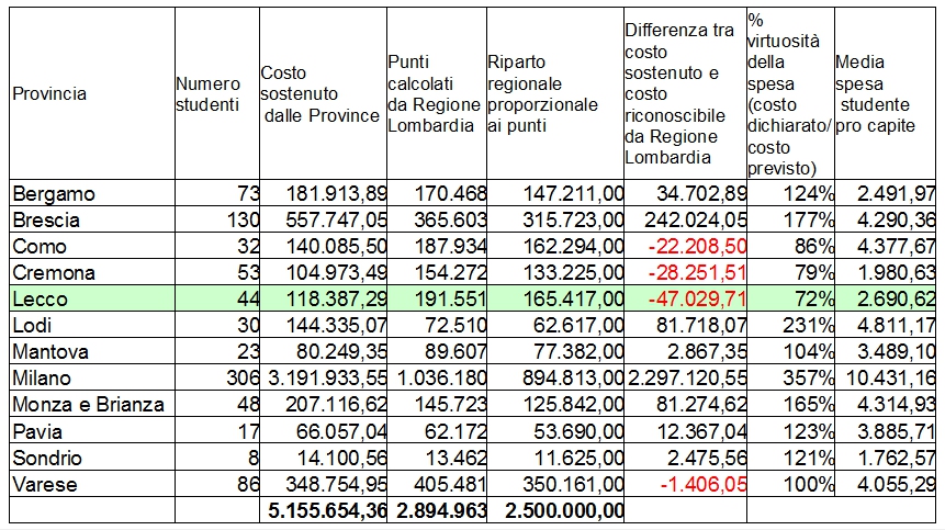 Per 44 studenti disabili i Comuni della provincia di Lecco hanno dichiarato una spesa complessiva di 118.387,29 euro, 47.030,00 euro in meno rispetto al budget previsto dalla Regione di 165.417,00 euro assegnato dal riparto proporzionale ai punti.