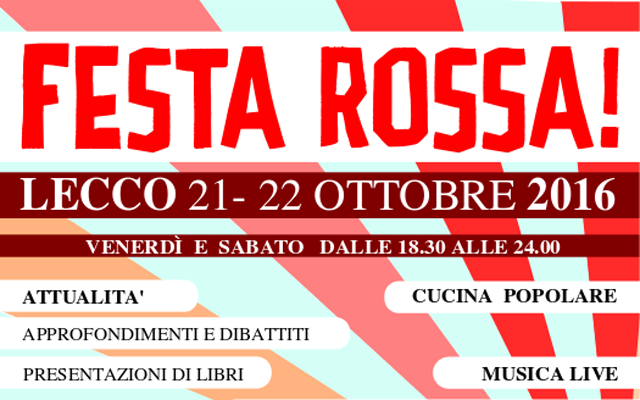 LECCO – Arriva a Lecco la Festa Rossa: due giorni di dibattiti, attualità, presentazione di libri, musica e cucina popolare organizzati da Sinistra Classe Rivoluzione Lecco in collaborazione con il Circolo Arci “La Ferriera”.