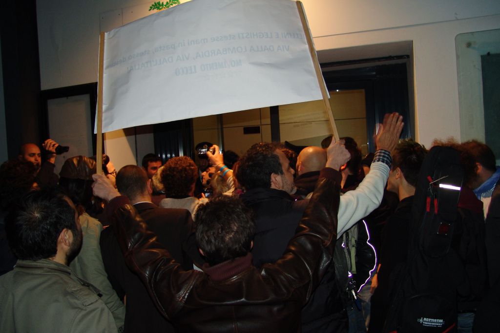 Ad attenderlo c’erano infatti l’associazione Qui Lecco Libera, il Movimento Cinque Stelle di Lecco e Rifondazione Comunista, con uno striscione recante la scritta “Povera patria schiacciata dagli abusi di potere, di gente infame che non sa cos’è il pudore”, citazione della nota canzone di Franco Battiato. Nei pochi metri che separavano la sua auto blu dall’entrata della sala, Formigoni è stato scortato da un cordone di sostenitori e dalla polizia, mentre dalla folla si levavano cori ingiuriosi.