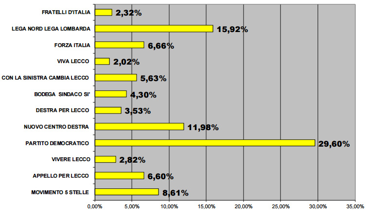 Niente a che vedere però con lo straordinario risultato del 2010, quando Brivio, dopo il mandato alla guida della Provincia, aveva sfidato e vinto Roberto Castelli, aggiudicandosi Palazzo Bovara con il 50,22%, ben 13.690 voti; solo il PD, nella coalizione che sosteneva l’attuale sindaco, aveva ottenuto il 36,29%, corrispondenti a 8560 preferenze.