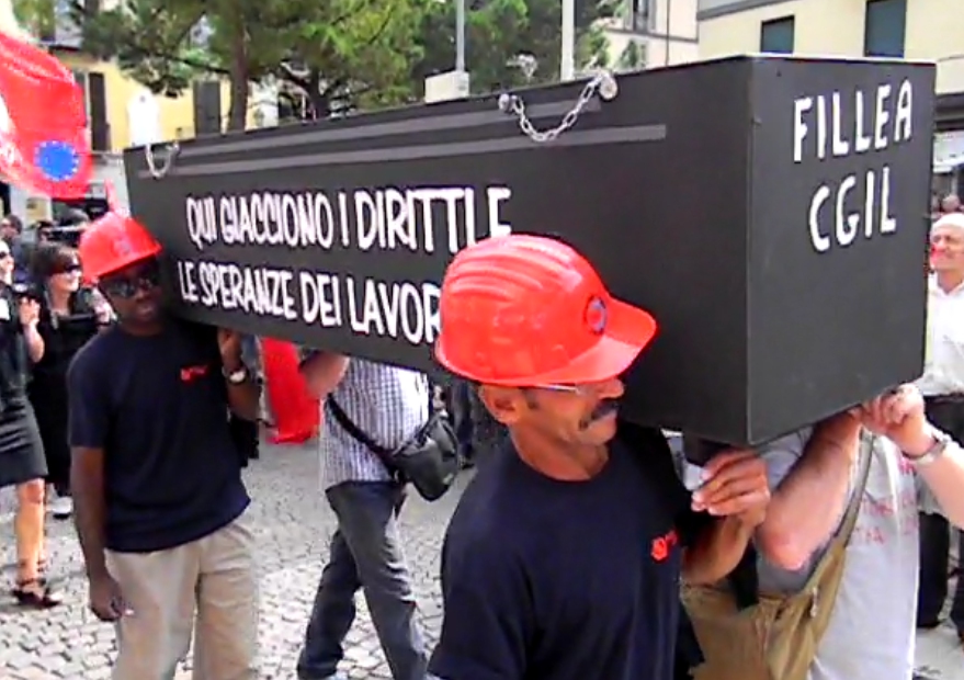 Quindi Landini prosegue: “L’ultima versione della manovra contiene anche una norma che stravolge la Costituzione, attacca lo Statuto dei Lavoratori alla contrattazione, mi riferisco all’articolo 8 della manovra, frutto della cattiveria, della paranoia rivendicativa del ministro del Lavoro (Maurizio Sacconi, ndr) che, come un toro quando vede la Cgil, tenta di picchiargli dentro le corna. Siamo alla follia, alla cattiveria sociale che si fa legge”.