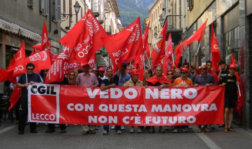 In quel di Lecco il corteo partito da via Besonda, sede della Cgil, si è snodato lungo le vie di cittadine per raggiungere la ditta Leuci, di fronte alla quale è stato effettuato un flash mob. Gli scioperanti in testa al corteo hanno repentinamente inforcato gli occhiali da sole e hanno cambiato lo striscione iniziale con un cartellone raffigurante la frase “Vedo nero con questa manovra non c’è futuro”. Dalle casse è quindi partita l’omonima hit di Zucchero, cantata a gran voce dai manifestanti. Dopo di che il corteo è ripreso raggiungendo corso Matteotti, Largo Montenero, il Comune e poi giù da via Cavour per fare ingresso in piazza Garibaldi dove si è svolto il comizio. Sul palco alcuni sindaci del territorio con la fascia tricolore (Barzago, Valgreghentino, Galbiate, Calco, Mandello, Cassago, Osnago, Monte Marenzo, Bellano, Casatenovo) con loro anche Virginio Brivio sindaco di Lecco che ha preso la parola dopo l’intervento di Wolfango Pirelli segretario della Cgil Lecco, comizio che si è concluso con l’intervento di Stefano Landini segretario generale Cgil Lombardia.