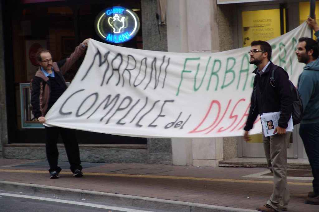 Su questo non erano per nulla d’accordo i rappresentati dell’associazione Qui Lecco Libera che, guidati dal coordinatore Duccio Facchini, hanno contestato il segretario leghista con uno striscione a lui indirizzato: “Maroni furbastro, complice del disastro”.