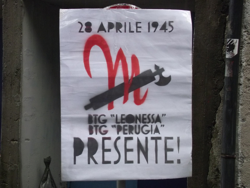 A commemorare il ricordo della fucilazione erano presenti anche il consigliere comunale Fdi Giacomo Zamperini e vari gruppi appartenenti alla destra radicale che hanno portato con loro un cartellone recante il simbolo del gruppo corazzato “Leonessa” e del battaglione “Perugia” e un tricolore con il fascio littorio.