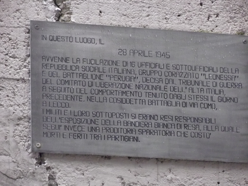“In questo luogo, il 28 aprile 1945 avvenne la fucilazione di 16 ufficiali e sottufficiali della repubblica sociale italiana, gruppo corazzato “Leonessa” e battaglione “Perugia” decisa dal tribunale di guerra del comitato di liberazione nazionale dell’Alta Italia a seguito del comportamento tenuto dagli stessi il giorno precedente, nella cosiddetta battaglia di via Como a Lecco. I militi e i loro sottoposti si erano resi responsabili dell’esposizione della bandiera bianca di resa, alla quale seguì invece una proditoria sparatoria che costò morti e feriti tra i partigiani”.