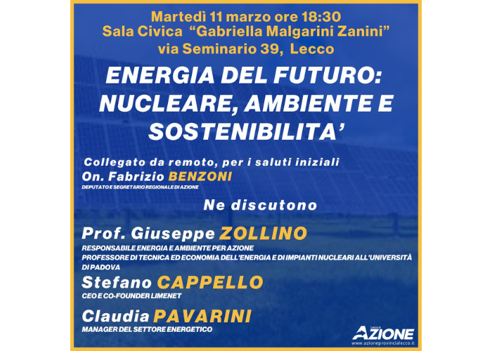 LECCO – La crisi climatica, la sicurezza energetica e la necessità di soluzioni sostenibili per l’ambiente e per le finanze di cittadini, Comuni e imprese pongono sfide urgenti per il futuro. Per approfondire questi temi e stimolare un dibattito costruttivo, Azione Lecco organizza l’11 marzo alle 18:30, in via Seminario a Lecco, l’evento “Energia del Futuro: Nucleare, Ambiente e Sostenibilità”.