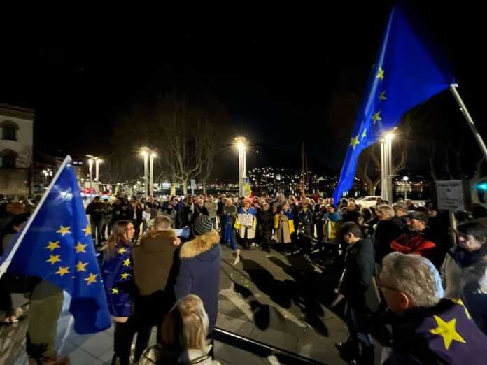 LECCO – Domenica sera in piazza Cermenati a Lecco centinaia di persone hanno manifestato il proprio fermo sostegno al popolo ucraino. Cittadini, gruppi politici e associazioni sono scesi in piazza, sotto le bandiere europee, italiane e ucraine, come reazione al comportamento tenuto dalla Casa Bianca e per chiedere una presa di posizione netta e autorevole da parte dell’Unione Europea sulla questione.
