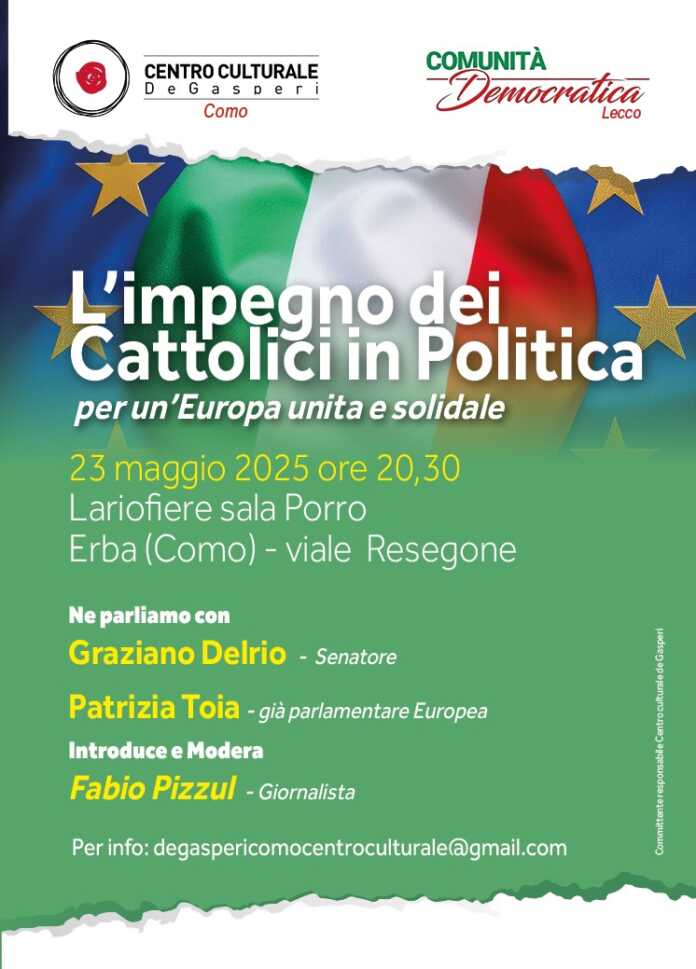 LECCO/ERBA – Il Centro Culturale De Gasperi di Como e la Comunità Democratica di Lecco organizzano un importante momento di riflessione pubblica dal titolo “L’impegno dei cattolici in politica per un’Europa unita e solidale”, che si terrà venerdì 23 maggio 2025 alle ore 20.30 a Erba, presso Lariofiere – Sala Porro.