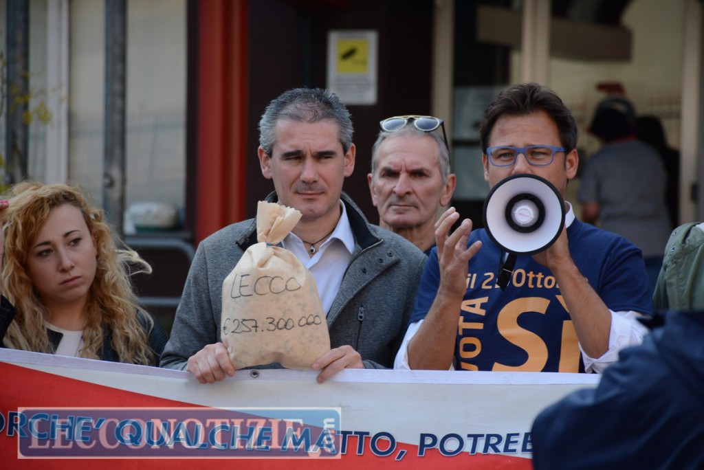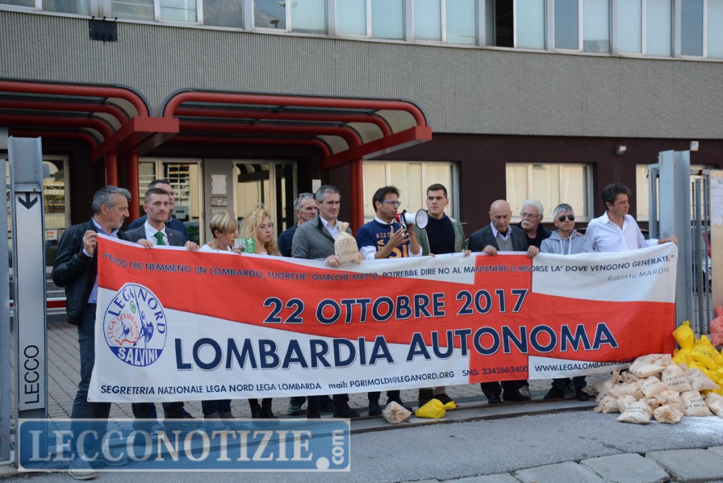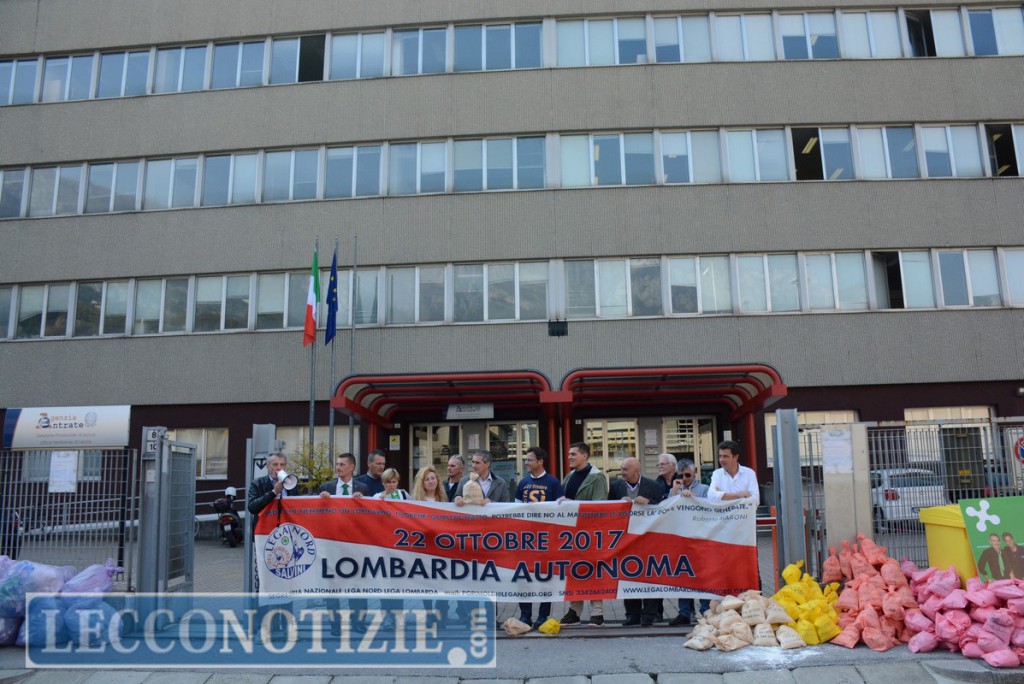 LECCO – ‘Blitz’ della Lega Nord di fronte all’Agenzia delle Entrate a Lecco: un presidio di protesta in vista del referendum che il 22 ottobre chiamerà i cittadini ad esprimersi sull’autonomia regionale.