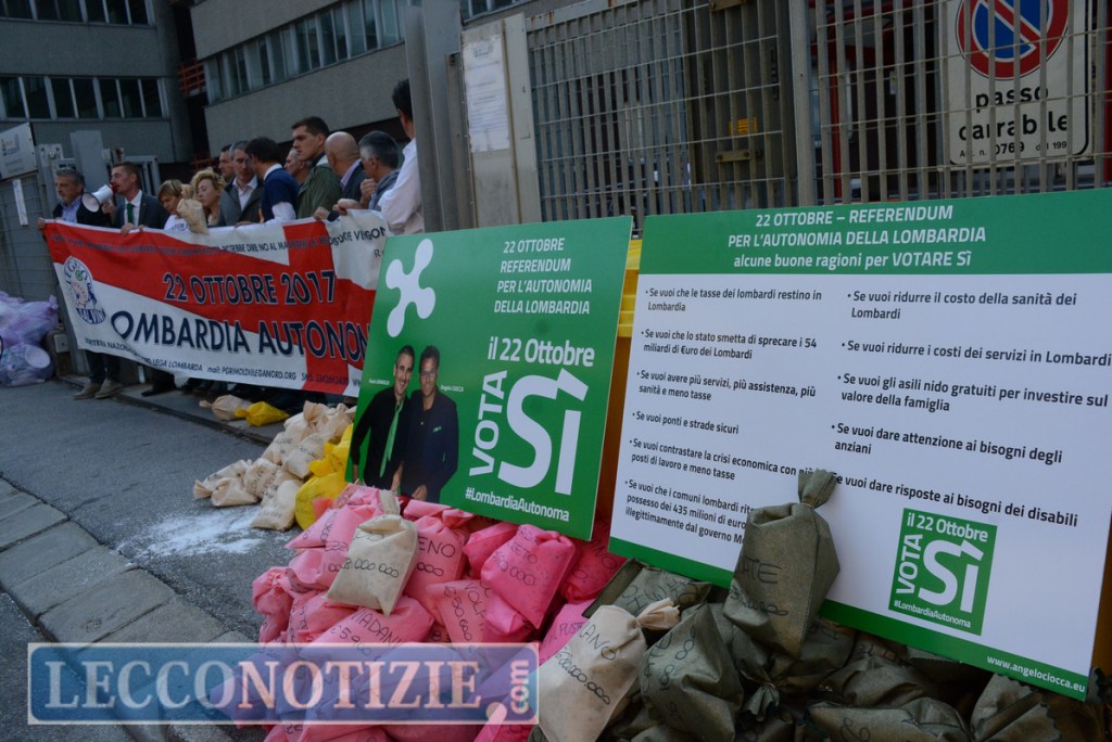 Il sit-in si è svolto nel primo pomeriggio di giovedì, con tanto di sacchetti di ‘soldi’ accatastati davanti ai cancelli dell’ente fiscale, simbolo delle risorse dei lombardi che, per i promotori del referendum, potrebbero restare sul territorio se la Lombardia fosse avesse una maggiore autonomia dallo Stato centrale.