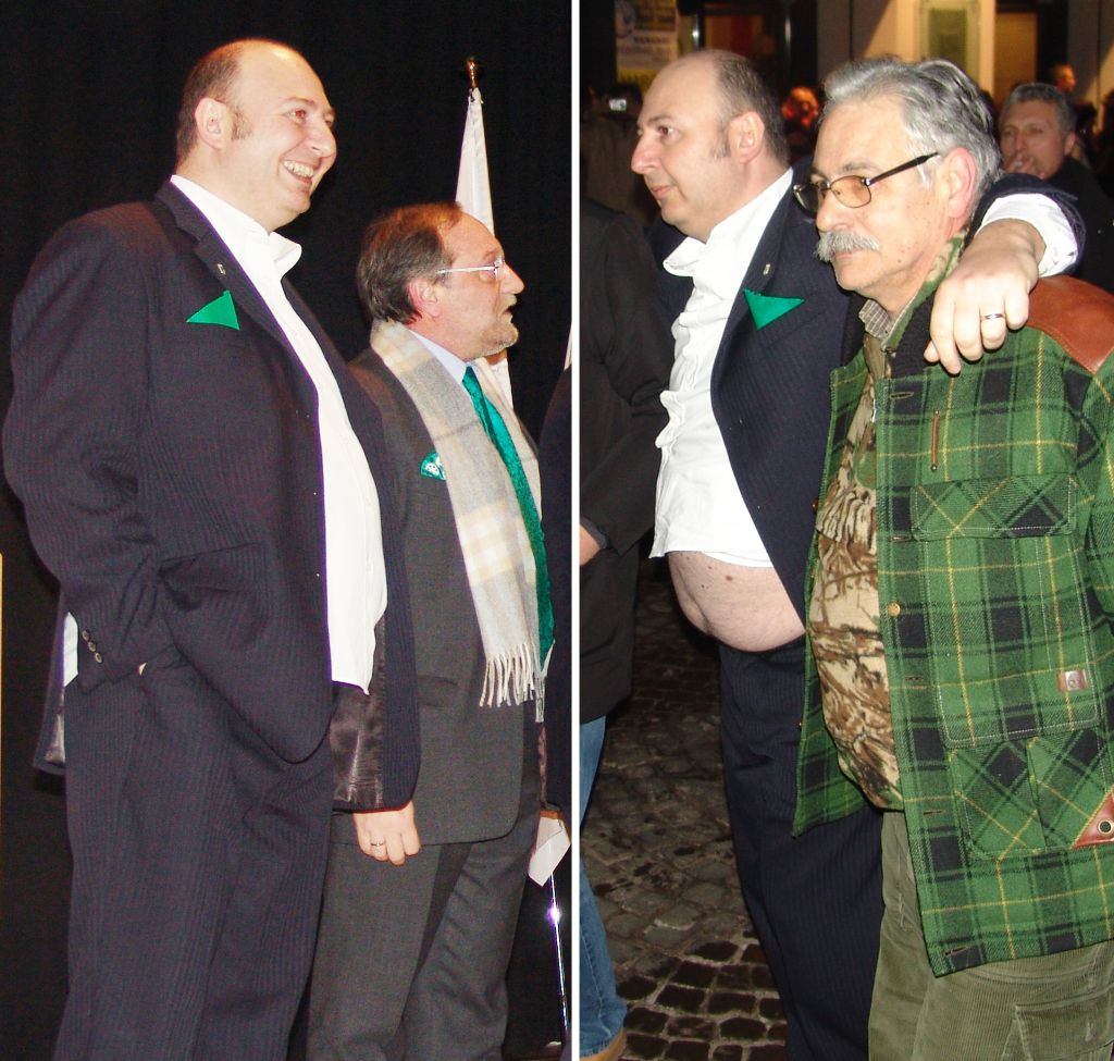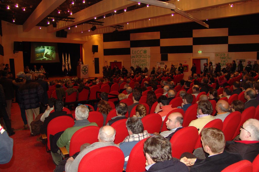 Nel frattempo, fuori dalla sala, si sfioravano momenti di tensione tra i sostenitori leghisti e alcuni contestatori di Qui Lecco Libera, un’associazione impegnata nella lotta alla mafia e alla mala politica, che protestava con alcuni striscioni. Protagonista indiscusso di questa fase è stato, senza dubbio, il segretario provinciale Ceresa: in una trasformazione degna del dottor Jekyll in Mr. Hyde, il segretario ha dismesso i panni del presentatore per indossare quelli del buttafuori, scacciando a “panciate” gli indesiderati. Il rito è terminato con il sostegno dei Giovani padani che hanno formato una catena umana a difesa della zona, intonando “canti tradizionali”; tra questi, spiccava il grido: “Comunista pezzo di merda” al quale non ha disdegnato di partecipare lo stesso Ceresa.