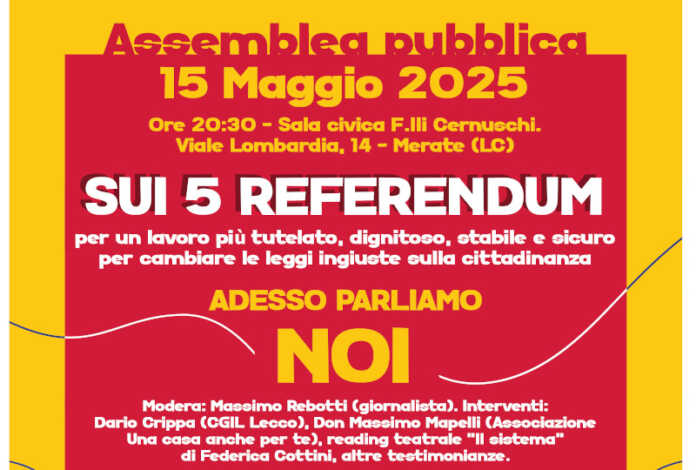 MERATE – A un mese dal voto dell’8 e 9 giugno il “Comitato Referendum del Meratese”, gruppo di cittadini che unisce associazioni, sindacati e comitati spontanei, vuole promuovere una corretta informazione e portare al centro del dibattito i temi dei quesiti referendari proposti, ovvero la sicurezza sul lavoro, i licenziamenti, la precarietà e la cittadinanza.